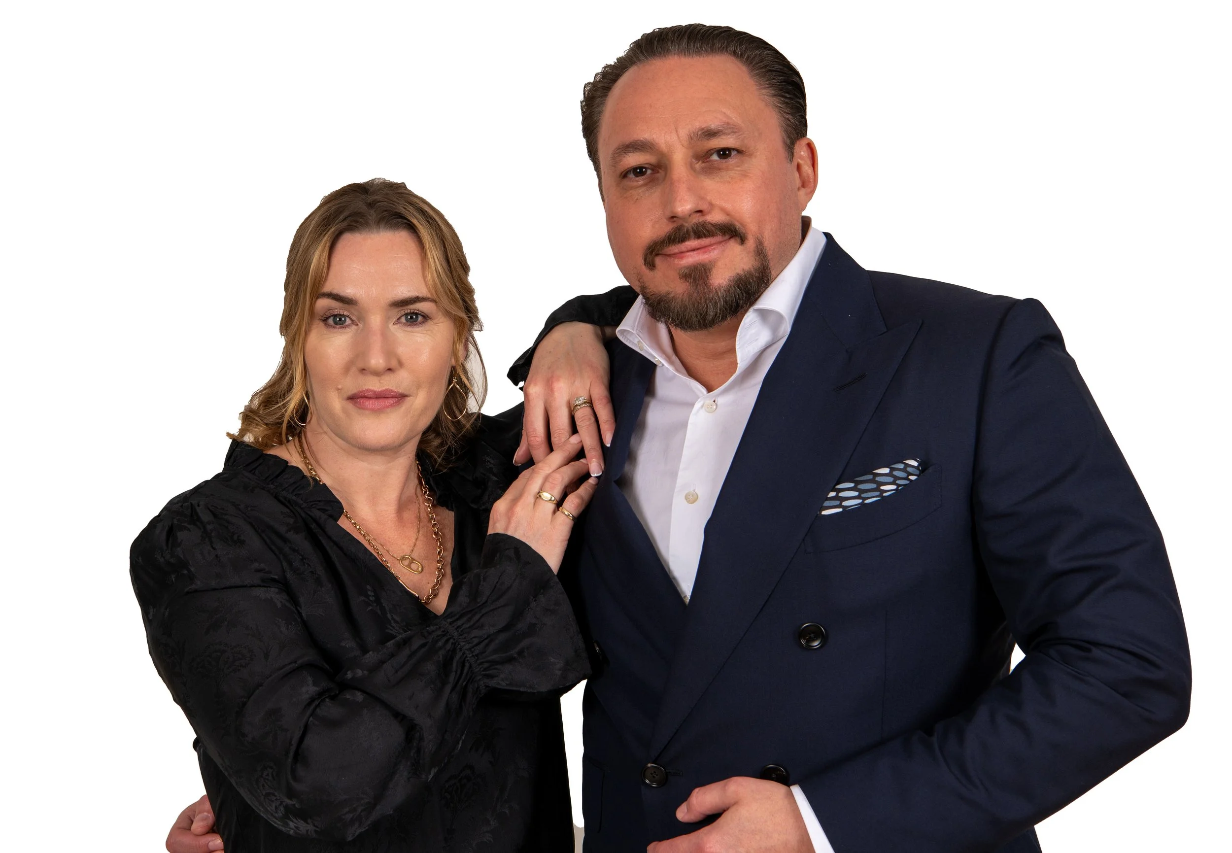 A man in a gray blazer and a woman in black clothing posing together against a plain background. The man is holding a film slate.